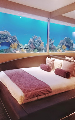 I booked for an Aqua Room, which is good for 2 person. I don't usually take rooms in a hotels without a window because it feels suffocating and I always want a view especially on a high rise level. But if the window was absent because it was replaced by a big aquarium full of different species of fish, well that will be a different story. I personally picked the Aqua room because we were joined by our 3 year old son and it will be a nice experience to him. The aquarium was not just a window size, it fully covered the whole width of the wall on the side of the bed. Wow!
